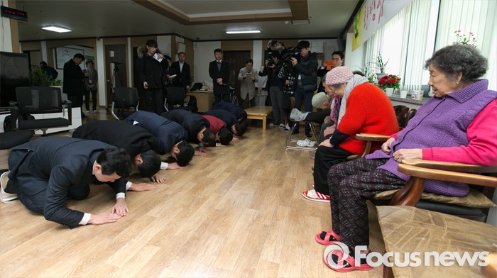 (광주=포커스뉴스) 병신년(丙申年) 새해 첫 날인 1일 오후 원유철 새누리당 원내대표 등 의원들이 경기도 광주 일본군 위안부 피해자 쉼터 나눔의 집을 방문해 할머니들에게 세배를 하고 있다.