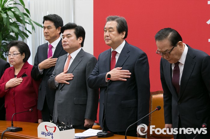 (서울=포커스뉴스) 새누리당 김무성(오른쪽 두번째) 대표와 원유철(가운데) 원내대표를 비롯한 최고위원들이 4일 오전 서울 여의도 국회에서 열린 새누리당 최고위원회의에 참석해 국민의례를 하고 있다. 사진 오른쪽부터 서청원 최고위원, 김 대표, 원 원내대표, 김태호, 김을동 최고위원.