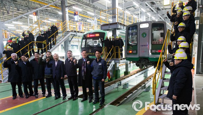 (서울=포커스뉴스) 이정원(왼쪽 다섯번쨰) 서울메트로 사장과 임직원들이 4일 오전 서울 군자차량기지에서 파이팅 구호를 외치고 있다.
