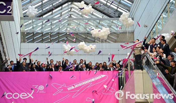 (서울=포커스뉴스) 4일 오전 서울 강남구 코엑스에서 열린 30주년 이색 시무식에 참석한 코엑스 임직원들이 종이비행기를 날리며 한 해의 힘찬 시작을 알리고 있다.