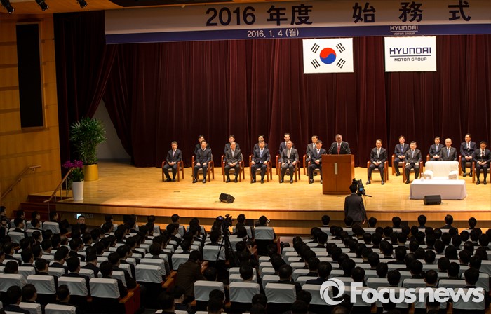 (서울=포커스뉴스) 4일 오전 서울 서초구 현대자동차 본사 대강당에서 열린 2016년도 시무식에 참석한 정몽구 현대차그룹 회장이 신년사를 하고 있다.