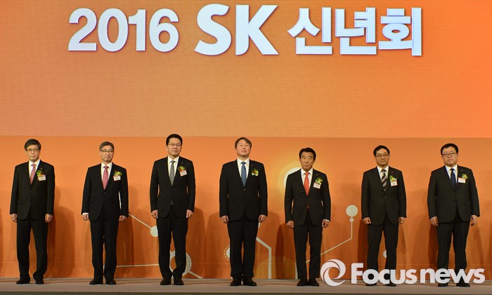 (서울=포커스뉴스) 최근 혼외로 아이를 둔 사실을 고백해 파문을 일으키고 있는 최태원(가운데) SK그룹 회장이 4일 오전 서울 광장동 워커힐호텔에서 열린 그룹 신년회에 참석해 임원들과 함께 무대에 올라 기념촬영을 하고 있다.