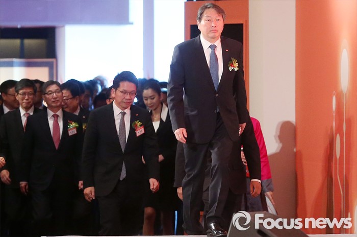 (서울=포커스뉴스) 최근 혼외로 아이를 둔 사실을 고백해 파문을 일으키고 있는 최태원 SK그룹 회장이 4일 오전 서울 광장동 워커힐호텔에서 열린 그룹 신년회에 참석해 단상 위로 올라가고 있다.