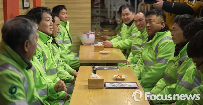 (서울=포커스뉴스) 신당 창당을 추진 중인 안철수 무소속 의원이 5일 오전 서울 영등포역 동부광장 인근에서 환경미화원들과 함께 새해맞이 청소를 마친 뒤 분식집에서 간담회를 하고 있다.
