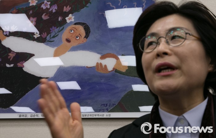 (서울=포커스뉴스) 5일 오전 서울 여의도 국회에서 여성가족위원회 전체회의가 산회된 후 취재진 질문에 답변하는 유승희 위원장 뒤로 故 김순덕 위안부 피해 할머니 유작 '끌려감'이 보이고 있다. 이날 여가위는 한일 위안부 합의와 관련 여성가족부의 현안보고를 들으려 했으나, 여야 간사간 협의가 이루어지지 않은 점을 들어 여당 의원과 김희정 장관은 참석하지 않았다.