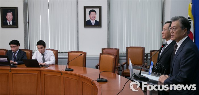 (서울=포커스뉴스) 문재인(오른쪽) 더불어민주당 대표가 5일 오전 서울 여의도 국회에서 이수혁 전 6자회담 수석대표의 입당식에 참석해 인사말을 하고 있다.