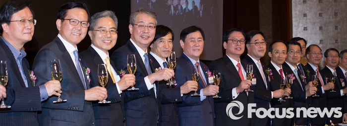 (서울=포커스뉴스) 5일 오후 서울 중구 롯데호텔에서 열린 '2016년 범금융 신년인사회'에서 최경환(오른쪽 여덟번째부터) 경제부총리 겸 기획재정부 장관, 이주열 한국은행 총재, 임종룡 금융위원장을 비롯한 참석자들이 기념촬영을 하고 있다.