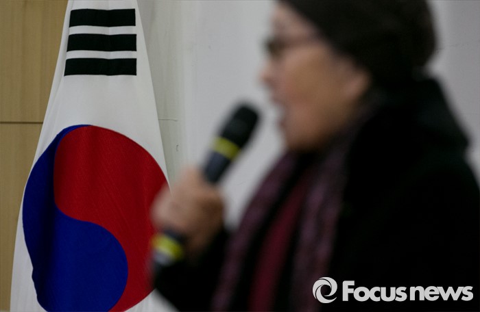 (서울=포커스뉴스) 5일 오후 서울 여의도 국회 의원회관에서 민주사회를 위한 변호사모임, 한국정신대문제대책협의회 등 주최로 열린 긴급진단, 2015년 한일 외교 장관 회담의 문제점 토론회에 참석한 위안부 피해자 김복동 할머니의 회담을 인정할 수 없는 이유에 대해 발언하고 있는 모습 뒤로 태극기가 보이고 있다.