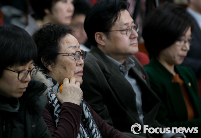 (서울=포커스뉴스) 5일 오후 서울 여의도 국회 의원회관에서 민주사회를 위한 변호사모임, 한국정신대문제대책협의회 등 주최로 열린 긴급진단, 2015년 한일 외교 장관 회담의 문제점 토론회에 참석한 위안부 피해자 이용수(왼쪽 두번째부터) 할머니, 홍익표 더불어민주당 의원, 김제남 정의당 의원이 김복동 할머니의 회담을 인정할 수 없는 이유에 대한 발언을 듣고 있다.