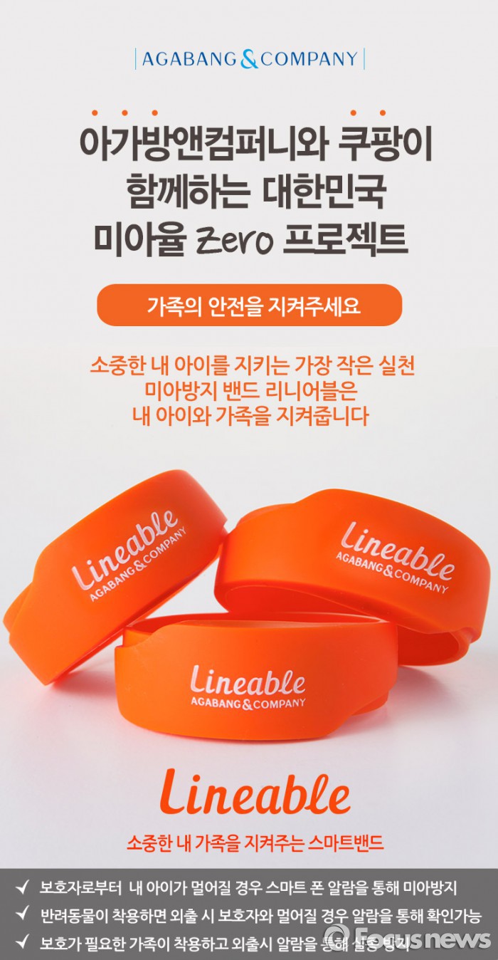 이 프로젝트는 6일부터 쿠팡에서 미아방지용 스마트 밴드 '리니어블'(Lineable)을 유통 마진 없이 공급가 5000원에 판매하는 캠페인이다.