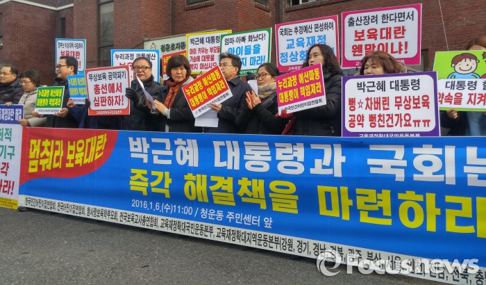 이들은 기자회견문에서 "17개 시도교육청 중 7개 교육청에서 어린이집 예산이 편성되지 않았고 4개 교육청은 유치원 예산까지 편성되지 않았다"며 "어린이집의 59%, 유치원의 48% 등에 해당하는 69만여명 아이들이 보육대란을 피할 수 없게 됐다"고 비판했다.