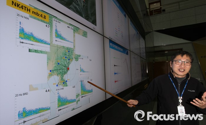 (대전=포커스뉴스) 북한이 수소탄 핵실험을 성공했다고 발표한 가운데 6일 오후 대전 유성구 한국지질자원연구원 지진연구센터에서 신진수 국토지질연구본부장이 북한 수소탄 실험에 대한 조사결과 브리핑을 하고 있다.