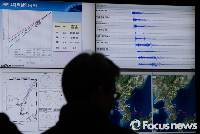 (대전=포커스뉴스) 북한이 수소탄 핵실험을 성공했다고 발표한 가운데 6일 오후 대전 유성구 한국지질자원연구원 지진연구센터에서 관계자들이 수집한 자료를 살피고 있다.