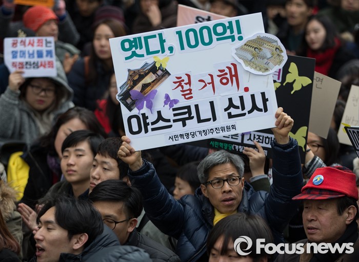 (서울=포커스뉴스) 6일 오후 서울 종로구 위안부 소녀상 앞에서 올해로 24주년을 맞은 일본군 위안부 문제 해결을 위한 1212차 수요 시위가 열리고 있다.