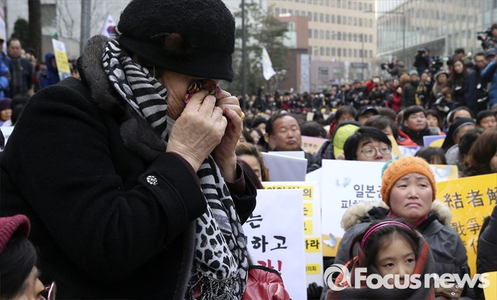(서울=포커스뉴스) 6일 서울 종로구 옛 일본대사관 앞에서 열린 제1212차 정기수요집회에서 이용수 할머니가 손수건으로 눈가를 훔치고 있다. 단일 주제로 벌이는 세계 최장기 집회로 알려진 정기수요집회는 1992년 1월 8일 시작해 금일로 24주년을 맞이했다.