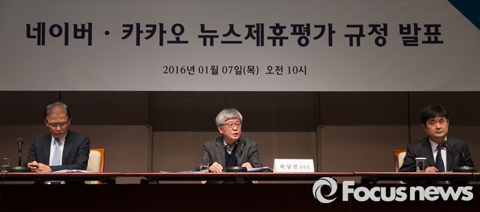 (서울=포커스뉴스) 인터넷 포털 네이버와 카카오의 뉴스 제휴 심사를 담당할 '뉴스제휴평가위원회'가 7일 오전 서울 중구 프레스센터에서 '네이버-카카오 뉴스 제휴 및 제재 심사 규정'을 발표하는 기자간담회를 진행하고 있다. 배정근 제 1 소위원장, 허남진 위원장, 김병희 제 2 소위원장(왼쪽부터)이 세부 규정에 대해 발표하고 있다. 발표한 규정은 3월 1일부터 시행된다.