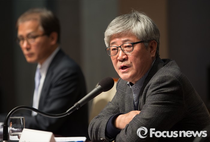 (서울=포커스뉴스) 인터넷 포털 네이버와 카카오의 뉴스 제휴 심사를 담당할 '뉴스제휴평가위원회'가 7일 오전 서울 중구 프레스센터에서 '네이버-카카오 뉴스 제휴 및 제재 심사 규정'을 발표하는 기자간담회를 진행하고 있다. 허남진 위원장이 세부 규정에 대해 발표하고 있다.