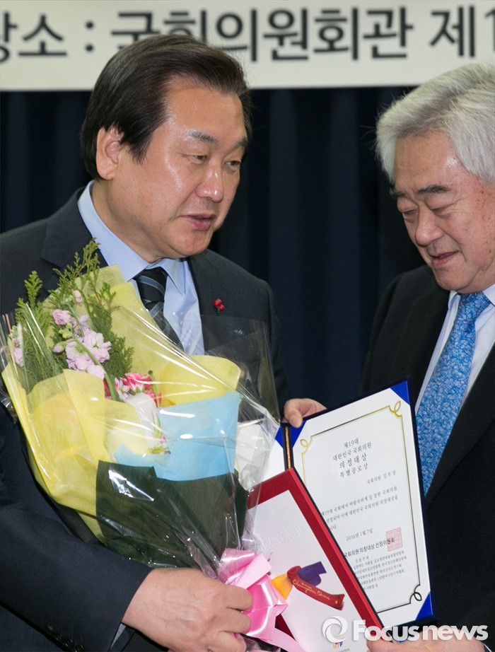 (서울=포커스뉴스) 김무성(왼쪽) 새누리당 대표가 7일 오전 서울 여의도 국회 의원회관에서 열린 대한민국 제19대 국회의원 의정대상 시상식에서 특별공로상을 받고 있다.