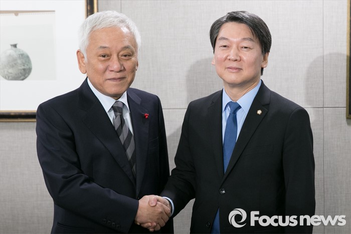 (서울=포커스뉴스) 더불어민주당을 탈당한 김한길(왼쪽), 안철수 의원이 7일 오후 서울 여의도 국회 의원회관 의원식당에서 오찬 회동을 위해 만나, 악수하고 있다.