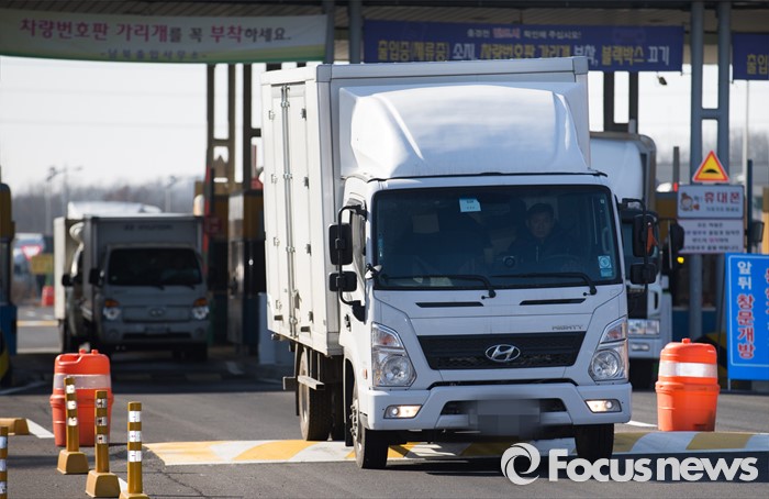 (파주=포커스뉴스) 7일 오후 개성공단 입주기업 차량들이 경기 파주시 남북출입사무소를 통해 입경하고 있다.