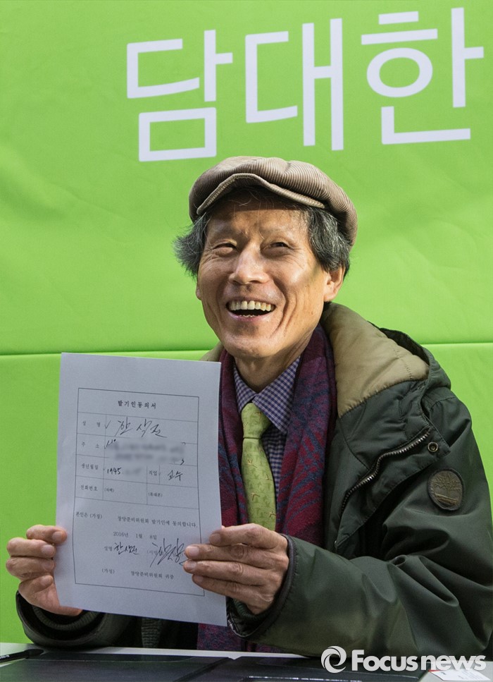 (서울=포커스뉴스) 8일 오전 서울 마포구 안철수 무소속 의원 당사에서 창당준비위원장직을 수락한 한상진 서울대 명예 교수가 발기인 신청서 작성 후 미소짓고 있다.