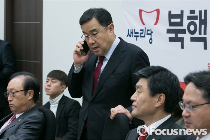 (서울=포커스뉴스) 김정훈(오른쪽 세번째) 새누리당 정책위의장이 8일 오전 서울 여의도 국회 새누리당 정책위원회에서 열린 북핵 관련 전문가 간담회에 참석하며 전화통화를 하고 있다.