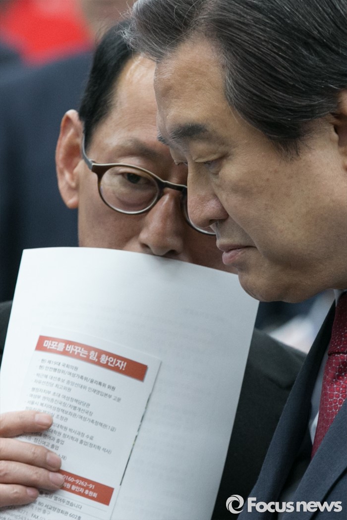 (서울=포커스뉴스) 김무성(오른쪽) 새누리당 대표와 김도읍 의원이 8일 오후 서울 여의도 국회에서 열린 의원총회에 참석해 논의 하고 있다.