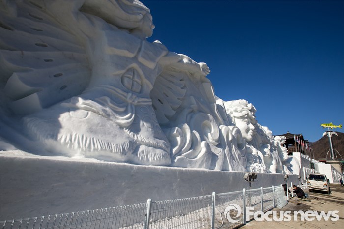 (화천=포커스뉴스) 산천어축제를 하루 앞둔 8일 오후 강원도 화천군 산천어축제 행사장인 화천천에 얼음조각 작품이 전시되고 있다. 산천어축제는 오는 9일부터 31일까지 강원도 화천군 화천천 및 3개읍면 일원에서 진행될 예정이다.