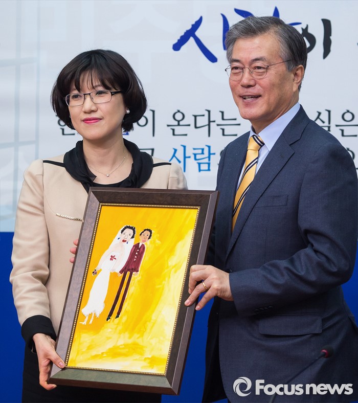 이에 대해 김 교수는 "2014년과 2015년, '스승의 날에 선물을 가져오지 말라'는 문자를 전 학생들에게 발송한 바 있다"며 "사실무근"이라고 해명했다.(서울=포커스뉴스) 문재인(오른쪽) 더불어민주당 대표가 6일 오전 서울 여의도 국회에서 열린 김선현 세계미술치료학회장 입당식에 참석해 김 학회장으로 입당원서 대신 그림을 전달받고 있다. 2016.01.06 박동욱 기자