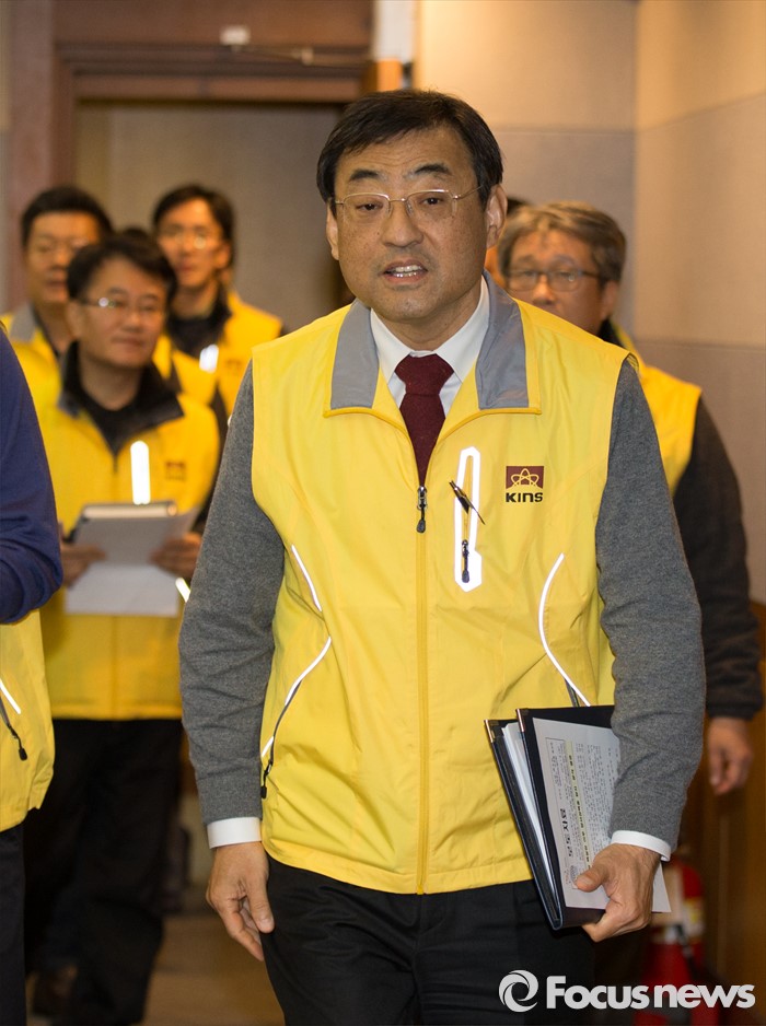 (대전=포커스뉴스) 8일 저녁 대전 유성구 한국원자력안전기술원 중회의실에서 김무환 한국원자력안전기술원장이 북한 핵실험 이후 반사성핵종 탐지·분석 결과 브리핑을 하기 위해 이동하고 있다.