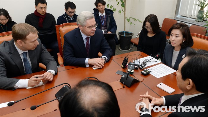 (서울=포커스뉴스) 11일 오후 서울 여의도 국회 외교통일위원회에서 나경원 위원장과 여야 의원, 알렉산드르 안드레예비치 티모닌 주한러시아대사가 북한 핵실험 관련 간담회를 하고 있다.