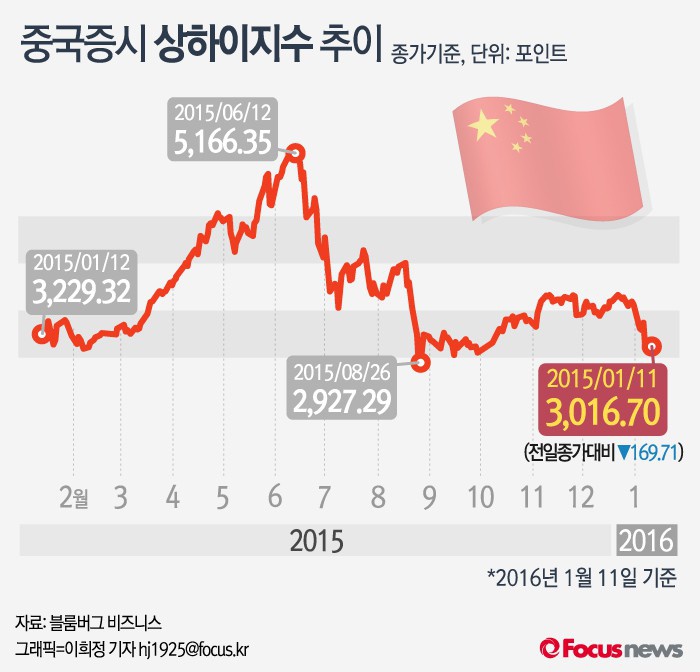 (서울=포커스뉴스) 11일 상하이종합지수는 전거래일보다 5.33%(169.71포인트) 떨어진 3016.70에 거래를 마쳤다.