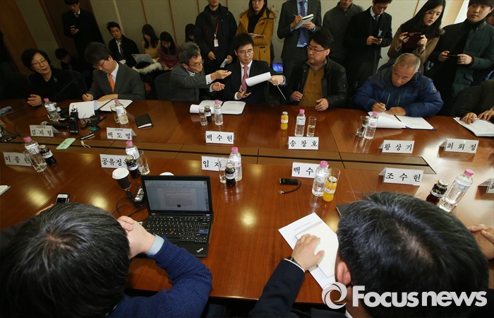 (서울=포커스뉴스) 12일 오전 서울 서대문구 법무법인 지평 회의실에서 열린 '삼성전자 반도체 등 사업장에서의 백혈병 등 질환 발병과 관련한 문제 해결을 위한 조정위원회'에서 조정 주체 교섭단 대표자들이 최종 합의서에 서명하고 있다.