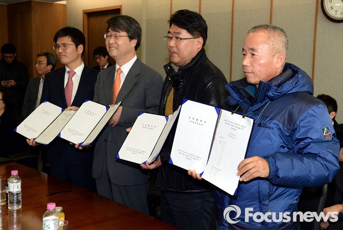 김지형 조정위원장도 "그동안 조정절차를 진행하면서 여러가지로 힘들었지만 당사자들의 양보에 힘입어 재해보상대책의 합의가 원만하게 이뤄졌다"며 "합의가 이뤄졌다는 자체가 상단한 진전이라고 평가하지만 나머지 조정의제인 보상과 사과에 대해서는 조정 3주체의 입장차이가 워낙 커서 아직도 완전한 타결에는 도달하지 못했다"고 설명했다.(서울=포커스뉴스) 12일 오전 서울 서대문구 법무법인 지평 회의실에서 열린 '삼성전자 반도체 등 사업장에서의 백혈병 등 질환 발병과 관련한 문제 해결을 위한 조정위원회'에서 조정 주체 교섭단 대표자들이 최종 합의서에 서명하고 있다. 삼성전자와 가족대책위원회, 반올림(반도체 노동자의 건강과 인권 지킴이) 등 이해당사자들은 외부 옴부즈만 위원회 도입을 골자로 하는 재해예방대책에 합의했으며 이날 합의는 사과, 보상과는 별개로 재해예방대책에 대한 합의다. 2016.01.12 조종원 기자 (서울=포커스뉴스) 삼성전자 반도체 사업장에서의 백혈병 등 질환 발병 문제 해결을 위한 조정위원회(조정위)는 12일 서울 서대문구 법무법인 지평 사무실에서 교섭단 대표 간 최종 합의서에 서명하기로 했다고 11일 밝혔다.2016.01.12 이희정 기자 (서울=포커스뉴스) 삼성전자 반도체 사업장 백혈병 등 직업병 문제와 관련해 삼성전자와 가족대책위원회(가대위), 반올림(반도체노동자의 건강과 인권지킴이) 등 3개 교섭주체가 12일 오전 서울 서대문구 충정로 법무법인 지평에서 '재해예방대책'에 관한 최종 합의서에 서명한 뒤 들어보이고 있다.왼쪽부터 백수현 삼성전자 커뮤니케이션팀 전무와 김지형 조정위원장, 송창호 삼성직업병가족대책위 대표, 황상기 반올림(반도체 노동자의 건강과 인권 지킴이) 교섭단 대표. 2016.01.12 조종원 기자