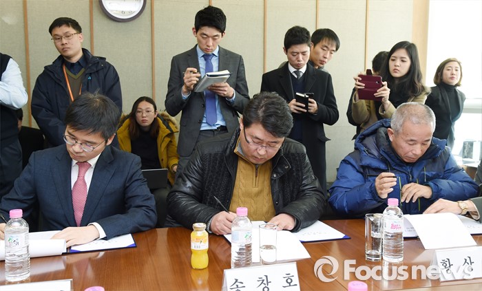 (서울=포커스뉴스) 12일 오전 서울 서대문구 충정로 법무법인 지평 회의실에서 열린 '삼성전자 반도체 등 사업장에서의 백혈병 등 질환 발병과 관련한 문제 해결을 위한 조정위원회'에서 조정 주체 교섭단 대표자들이 최종 합의서에 서명을 하고 있다.
