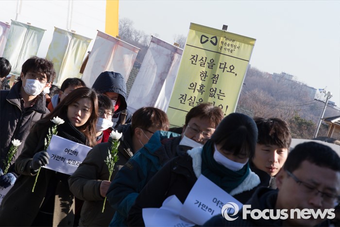 (안산=포커스뉴스) 12일 오후 경기도 안산시 세월호 사고 희생자 정부 합동분향소에서 유가족및 시민들이 416 추모식과 분향을 마친후 단원고까지 행진을 시작하고 있다.