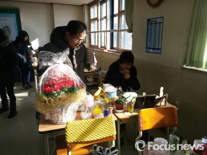 유가족들은 헌화를 하며 희생학생의 책상 앞 의자에 앉아 눈물을 쏟았고 조용히 기도를 하거나 멍하니 사진을 계속 쳐다보기도 했다.