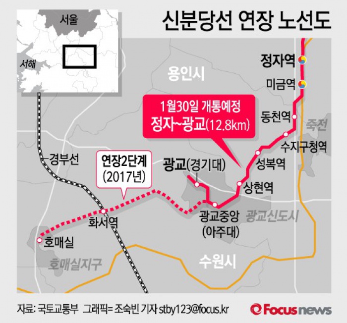 (서울=포커스뉴스) 정자역에서 용인시를 거쳐 수원시 광교까지 연결되는 12.8㎞ 구간의 신분당선 연장선이 내년 2월경에 개통될 예정이다. 동천역과 수지구청역, 성복역, 상현역이 들어설 예정이다.