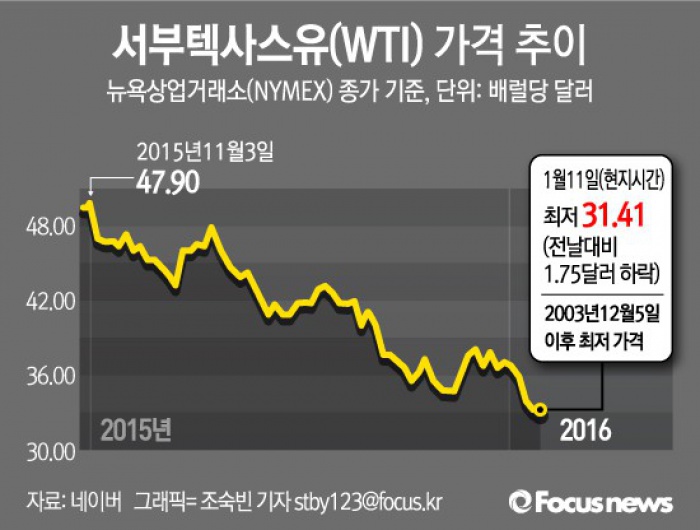 영국 최대 은행인 로열뱅크오브스코틀랜드(RBS)도 최악의 상황이 발생할 경우 배럴당 16달러까지 떨어질 수 있다고 내다봤다.(서울=포커스뉴스) 11일(현지시간) 뉴욕상업거래소(NYMEX)에서 2월 인도분 서부텍사스산 원유(WTI)는 전날대비 1.75달러(5.3%) 떨어진 배럴당 31.41달러로 2003년 12월 이후 최저치를 기록했다. 2016.01.12 조숙빈 기자
