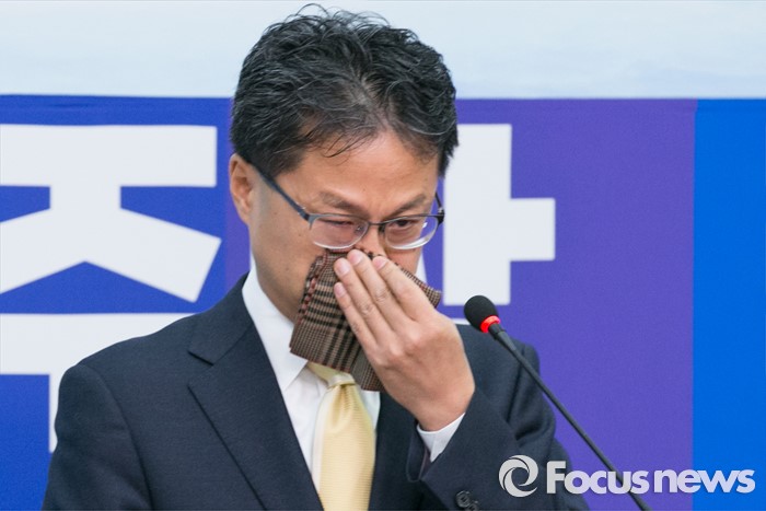 (서울=포커스뉴스) 재정부 국고국 과장을 역임한 국가재정 전문가 김정우 세종대 교수가 13일 오전 서울 여의도 국회 더불어민주당 대표회의실에서 입당 기자회견을 하며 눈물을 흘리고 있다. 김 교수의 부친은 김철배 더민주 강원도당 고문으로 12대 총선부터 15대 총선까지 5번(보선 1회 포함)을 철원, 화천, 양구 지역에서 범민주당의 이름으로 출마해, 5번 내리 낙선했다.