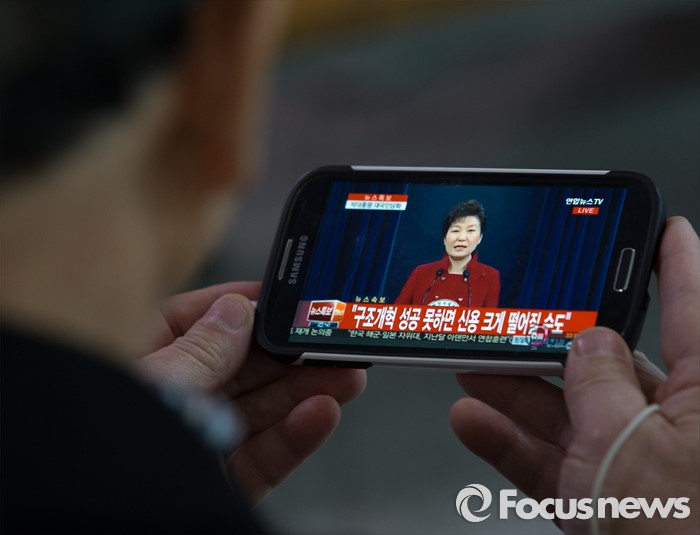 (서울=포커스뉴스) 13일 오전 서울역 대합실에서 한 시민이 DMB를 이용해 박근혜 대통령의 대국민 담화 및 기자회견을 시청하고 있다.