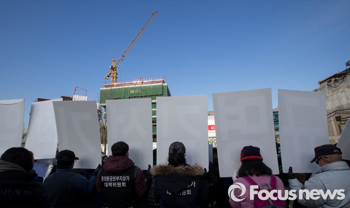 (서울=포커스뉴스) 13일 오전 서울 용산구 남일당 주차장에서 열린 '용산참사 7주기 추모주간 선포' 기자회견의 손팻말을 너머 건설현장이 보이고 있다.