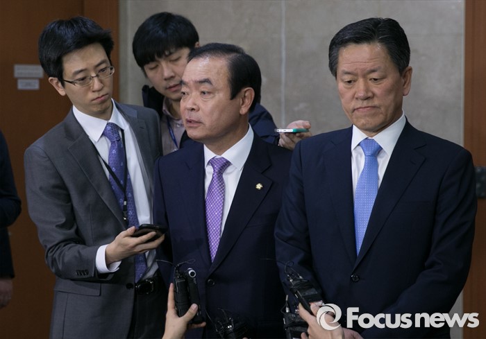 (서울=포커스뉴스) 13일 오전 서울 여의도 국회 정론관에서 장병완(왼쪽), 주승용 더불어민주당 의원이 탈당 기자회견을 마친 뒤 취재진 질문에 답하고 있다.
