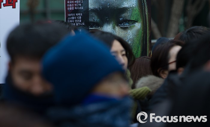 (서울=포커스뉴스) 13일 오후 서울 종로구 구 일본대사관 앞에서 열린 제1213차 일본군 위안부 문제해결을 위한 정기수요집회에서 참가자들이 손피켓을 들고 있다.