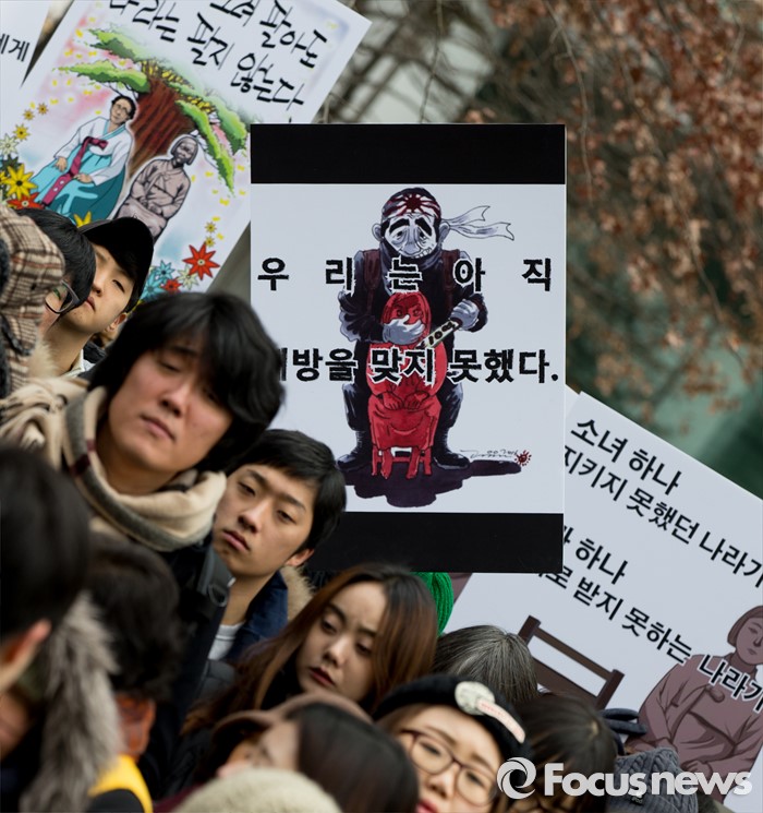 (서울=포커스뉴스) 13일 오후 서울 종로구 구 일본대사관 앞에서 열린 제1213차 일본군 위안부 문제해결을 위한 정기수요집회에서 참가자들이 손피켓을 들고 있다.
