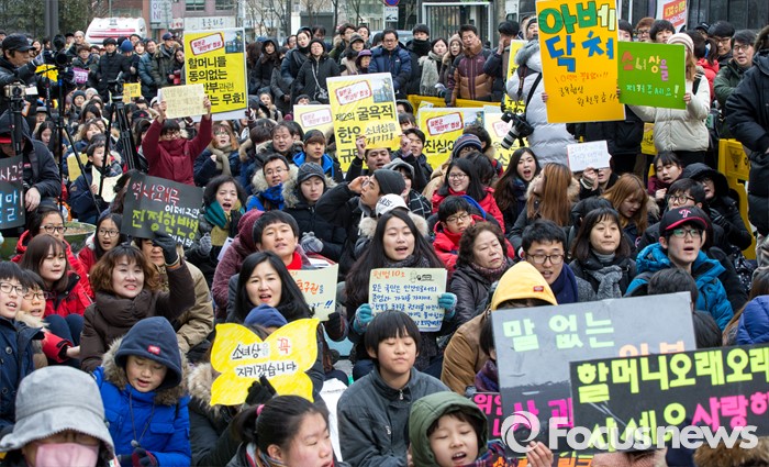 (서울=포커스뉴스) 13일 오후 서울 종로구 옛 일본대사관 앞에서 열린 제1213차 정기수요집회에서 참석자들이 일본의 공식 사과와 법적 책임을 요구하는 구호를 외치고 있다.