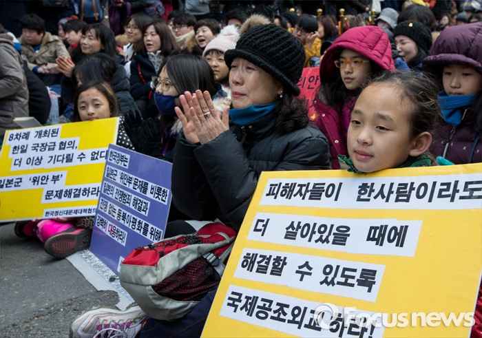 (서울=포커스뉴스) 13일 오후 서울 종로구 옛 일본대사관 앞에서 열린 제1213차 정기수요집회에 참석한 어린이들이 일본의 공식 사과와 법적 책임을 요구하는 팻말을 들고 있다.