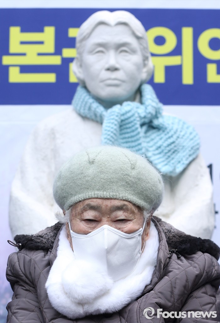 (서울=포커스뉴스) 13일 오후 서울 종로구 옛 일본대사관 앞에서 열린 제1213차 일본군 위안부 피해자 문제 해결 위한 정기 수요시위에 자리한 이옥선 할머니가 생각에 잠겨 있다.