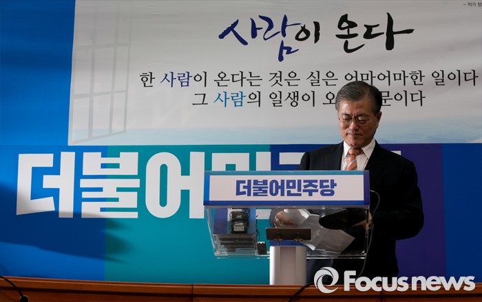 (서울=포커스뉴스) 문재인 더불어민주당 대표가 14일 오후 서울 여의도 국회에서 지난 2012년 대선 당시 박근혜 대통령의 경제민주화 공약을 만든 김종인 전 의원을 조기선대위원장으로 영입한 것과 관련 기자간담회를 위해 입장하고 있다.