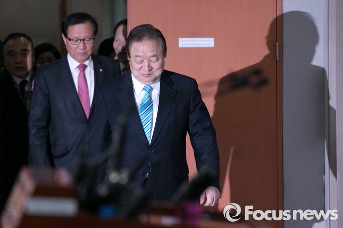 (서울=포커스뉴스) 정대철(앞) 더불어민주당 상임고문이 15일 오전 서울 여의도 국회 정론관에서 탈당 표명을 위한 기자회견에 입장하고 있다.